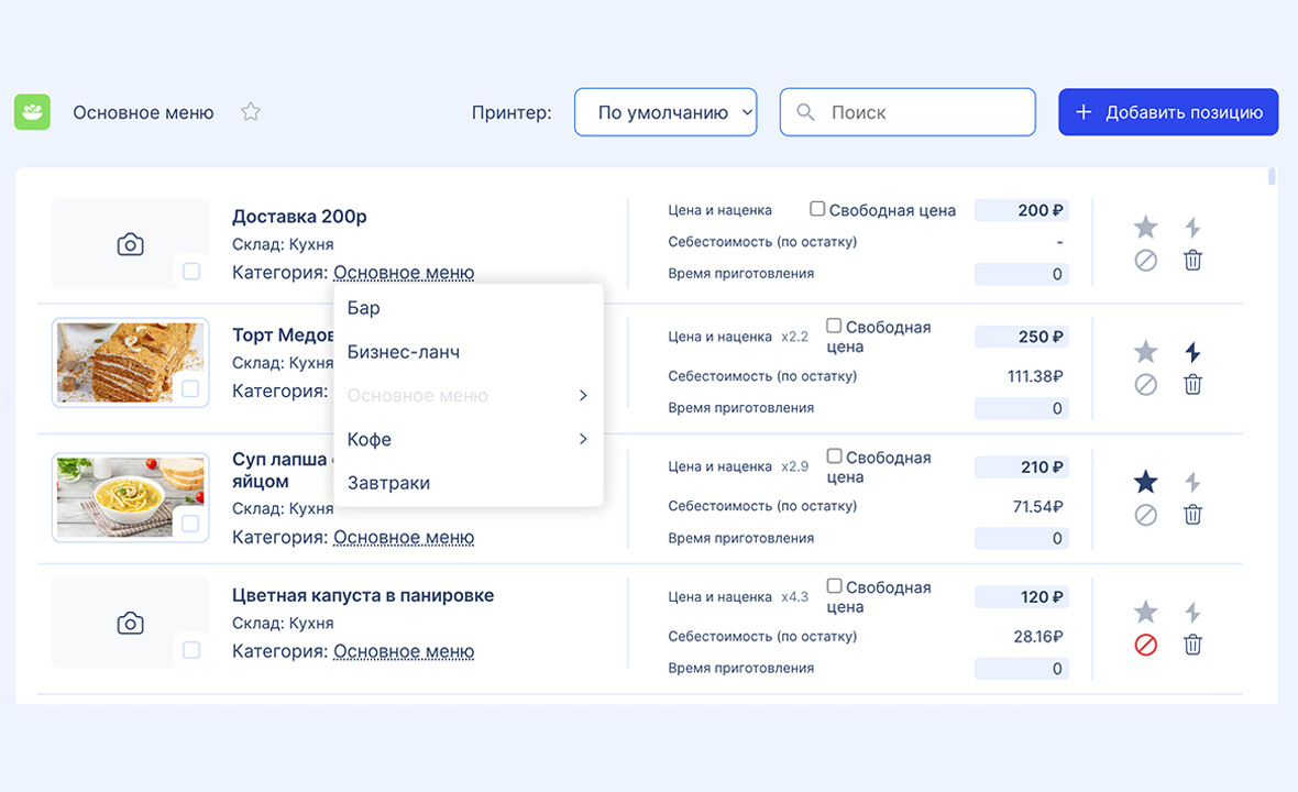- курсы, удаление, распределение блюд